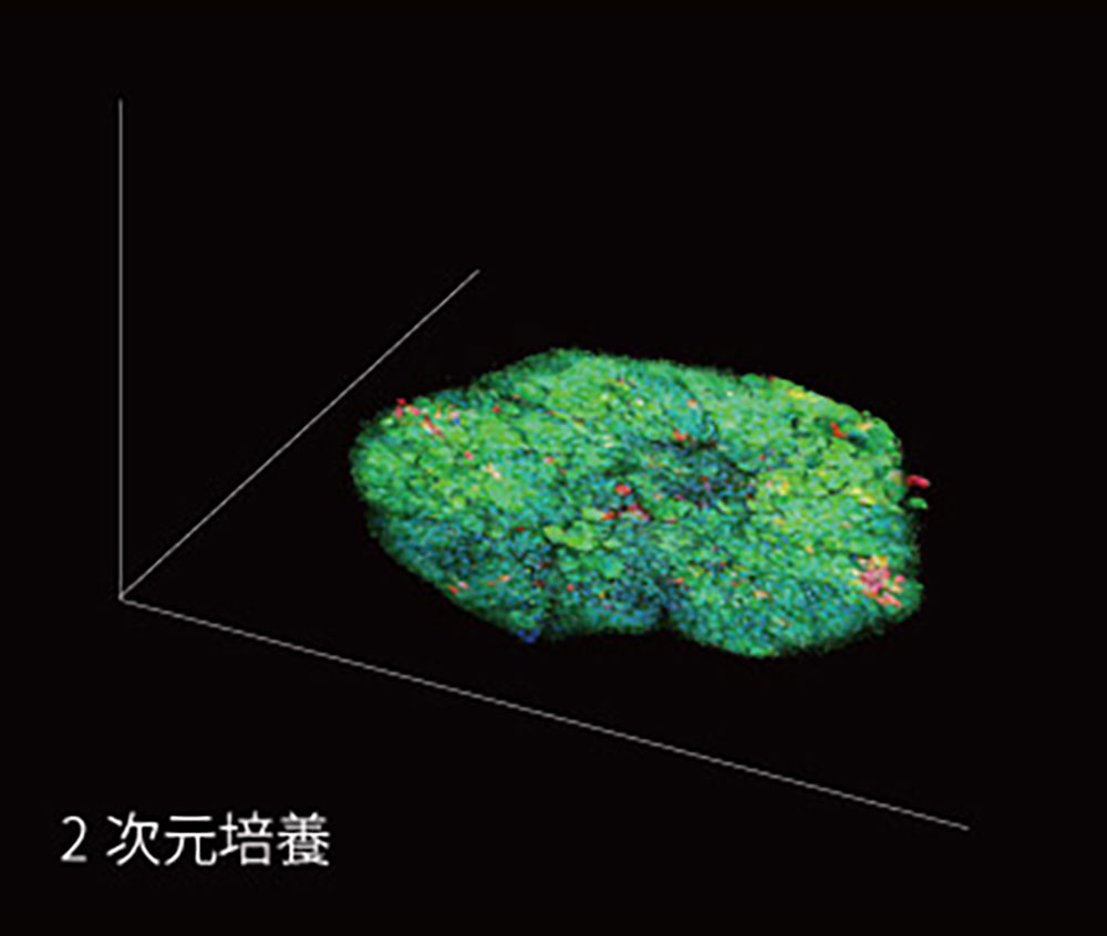 2次元培養は細胞同士が平面的に接触しており、細胞間の刺激伝達は横方向のみ。培地、薬剤は上方から直接供給されます。