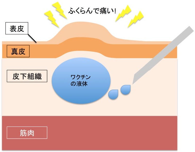 予防接種などのように、皮膚の下にある皮下組織に注射を打つ方法で、筋肉注射と比べると痛みが少ないです。皮下組織には血管が少ないため、吸収速度はゆっくりで、血中濃度が、長時間保ちながら穏やかに効いていきます。そのため、製剤がその場に駐留することになり、一時的に腫れの症状を起こします。